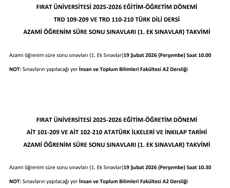 Ek Sınav-I Tarihleri : 16 Şubat 2026- 20 Şubat 2026